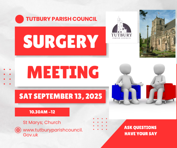 Tutbury Parish Councillors will be at the St Mary’s Church Coffee Morning on Saturday 13th September, 10.30am – 12.00pm.